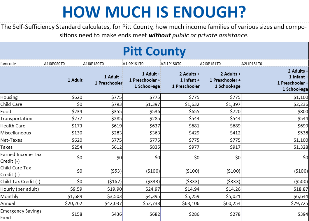 A family of four (two adults and two kids) living in Pitt County is classified as living in poverty when the household makes a combined $24,600. That same family would have to make over $60,000 in order to afford basic needs without public or private assistance.